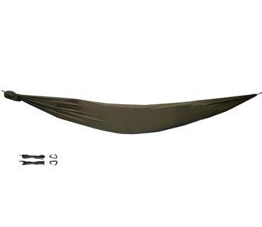 Bij deze hangmat wordt meegeleverd: de Bushmen ZEN hangmat XL in groen, 2 ultralichte aluminium karabiners, 2 ophangkoorden van 3 meter en een handige transportzak.